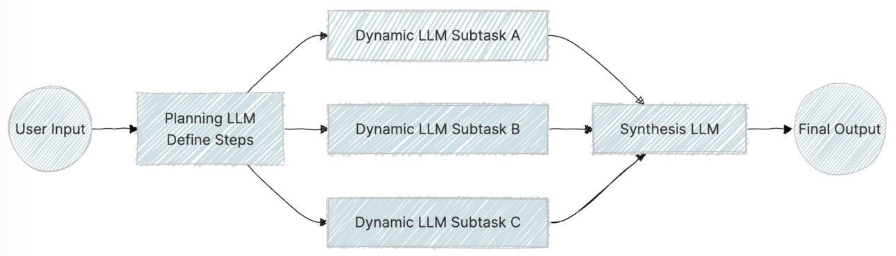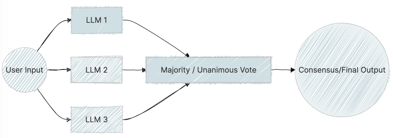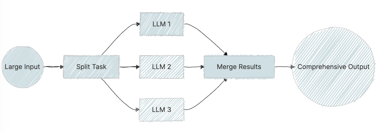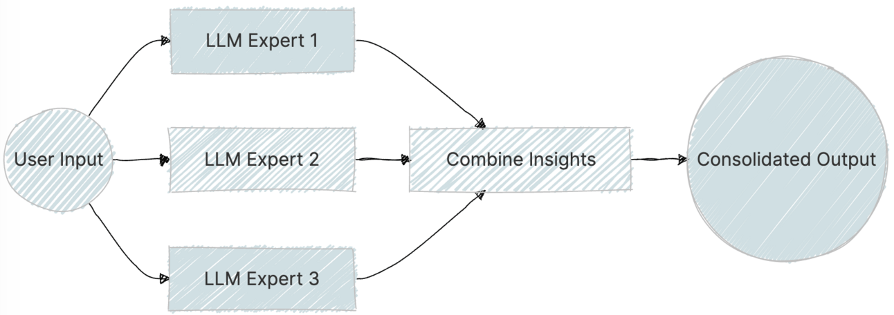 In this pattern, the same input is analyzed simultaneously by multiple LLMs, each acting as a specialized expert.