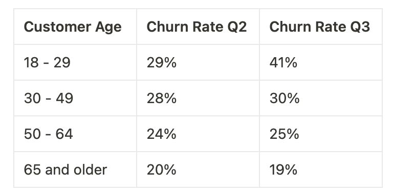 This table reveals that younger customers are more likely to churn, and this trend increased in Q3.