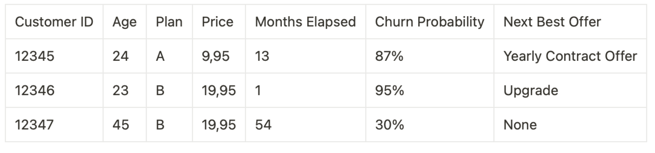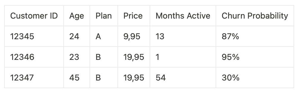 Let's go back to our telecom company scenario. After analyzing the factors that influence customer churn risk, we could use them to predict the actual risk for each customer. Here's what a (very simplified) churn prediction table might look like: