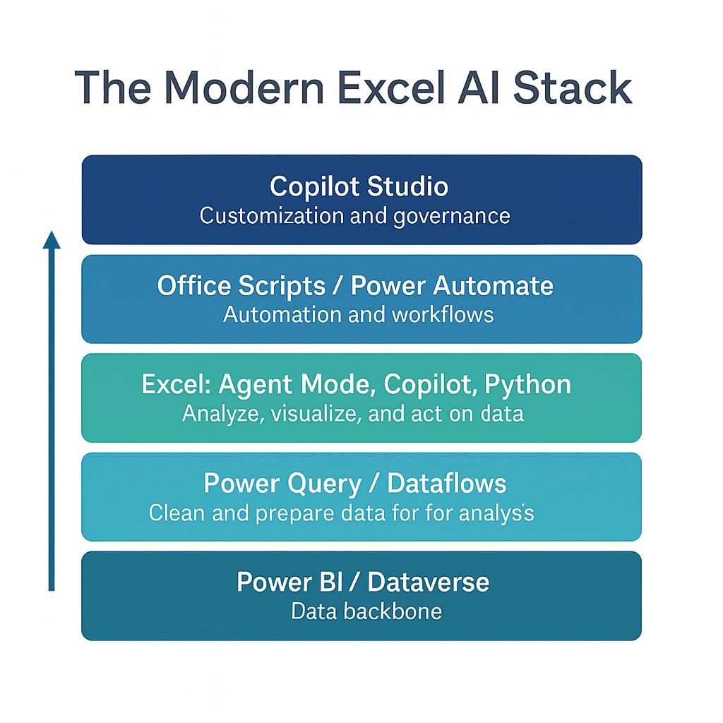 Here's the modern Excel AI stack, from foundation to orchestration: