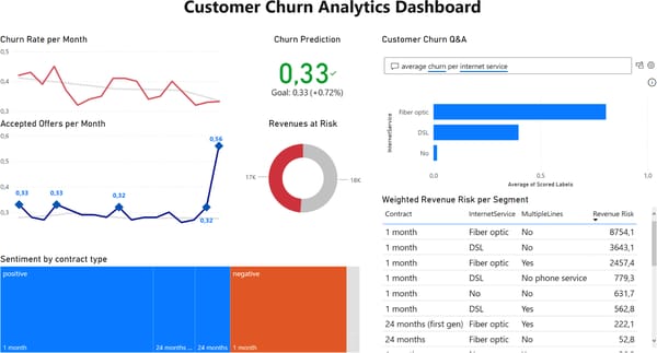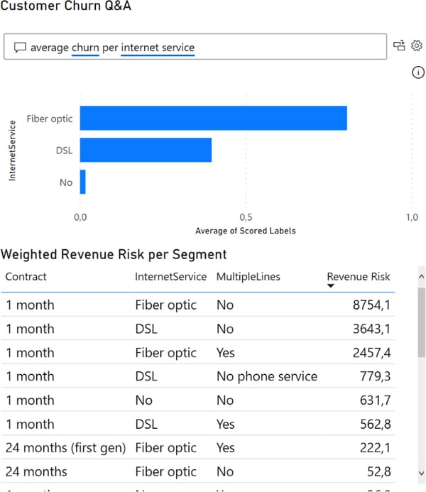 The table shows a combination of historic BI data and AI predictions where the new field Revenue Risk was generated in Power BI as a quick measure that multiplies a customer’s monthly revenue with their individual churn probabilities.
