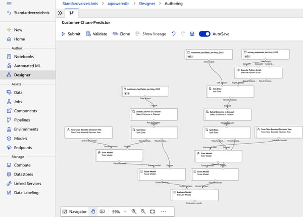 To train the churn prediction model, we create a custom ML workflow in Azure ML Designer.