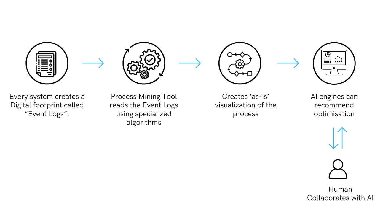 Process Mining is a family of analytics techniques for making sense of this data – uncovering of what actually happens in your workflows versus what you think happens. It is effectively an X-ray of your end-to-end business process. From thereon, it can help identify inefficiencies, bottlenecks, rework, compliance gaps, and automation opportunities.