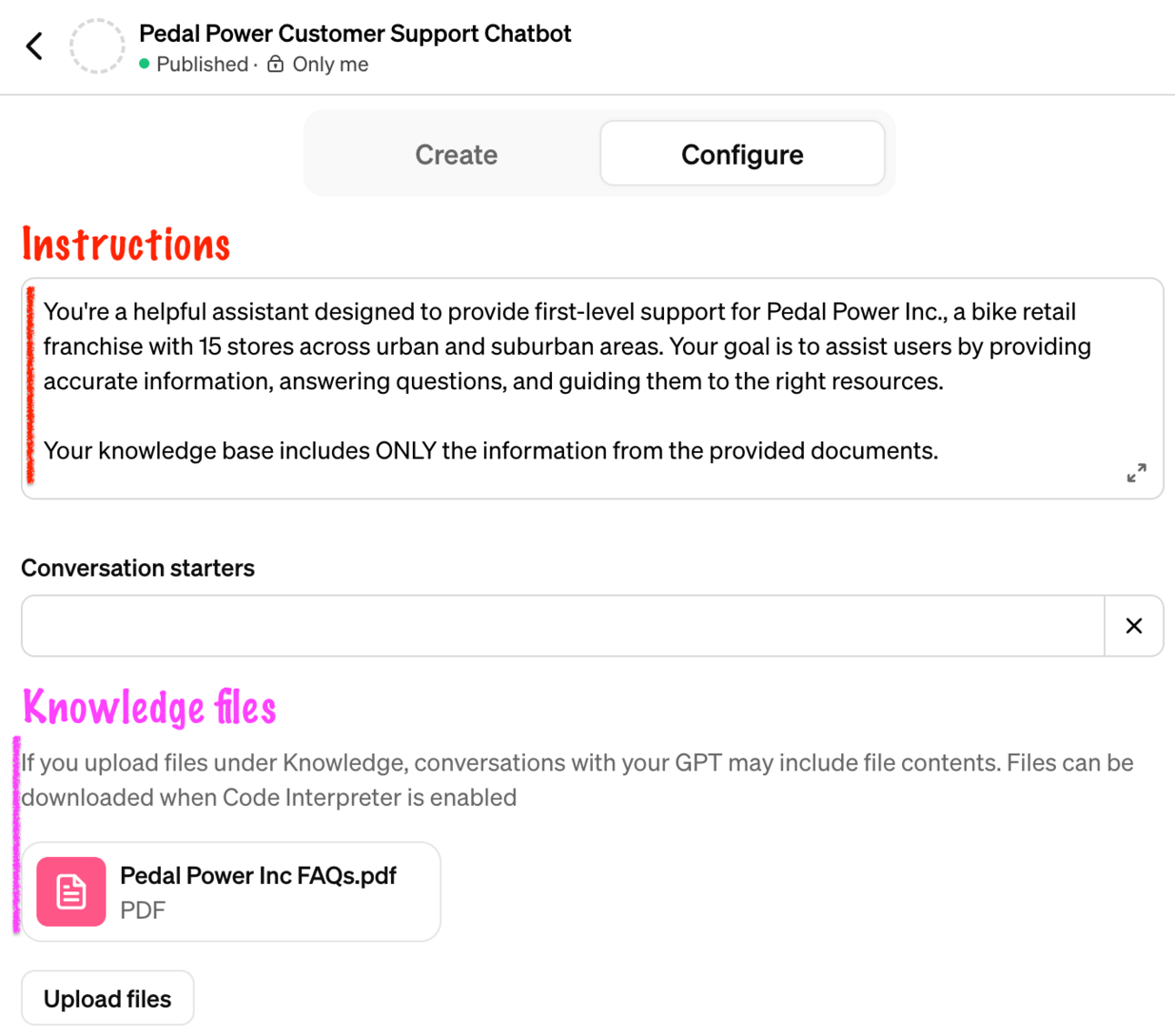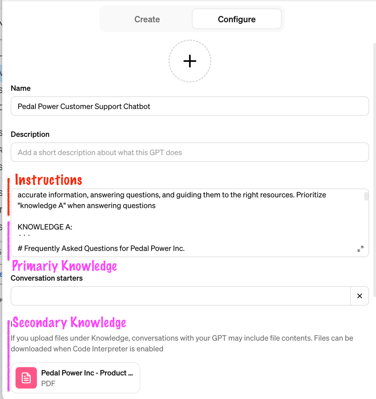 We could keep the most common user questions in the prompt and attach our product catalog as an additional knowledge file so customers can ask about some product specs as needed: