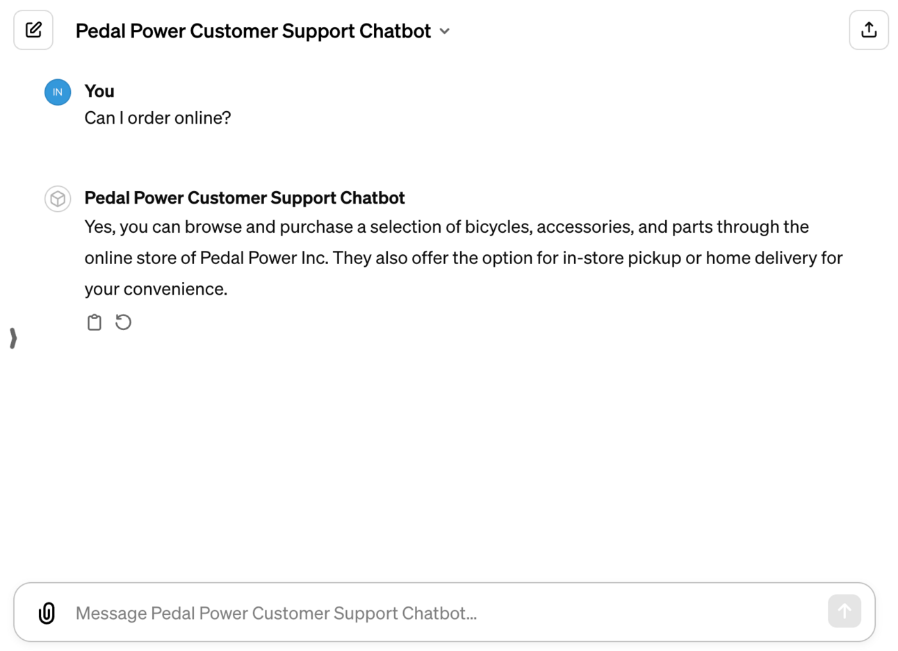 Let's say we're building a customer support chatbot for a local bike store. We could include all of our customer FAQs (and maybe even our entire help desk manual) in the instructions. That way, your chatbot would be able to answer a lot of customer questions right out of the box, with zero overhead.