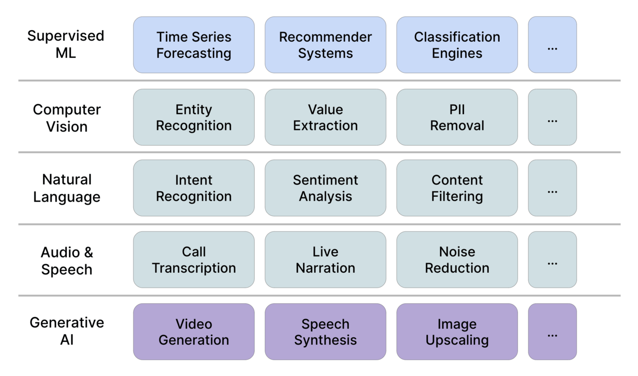 To recap, besides Generative AI, we have Supervised Machine Learning, Computer Vision, Natural Language Processing (NLP) and Audio / Speech that we can leverage for different business problems.