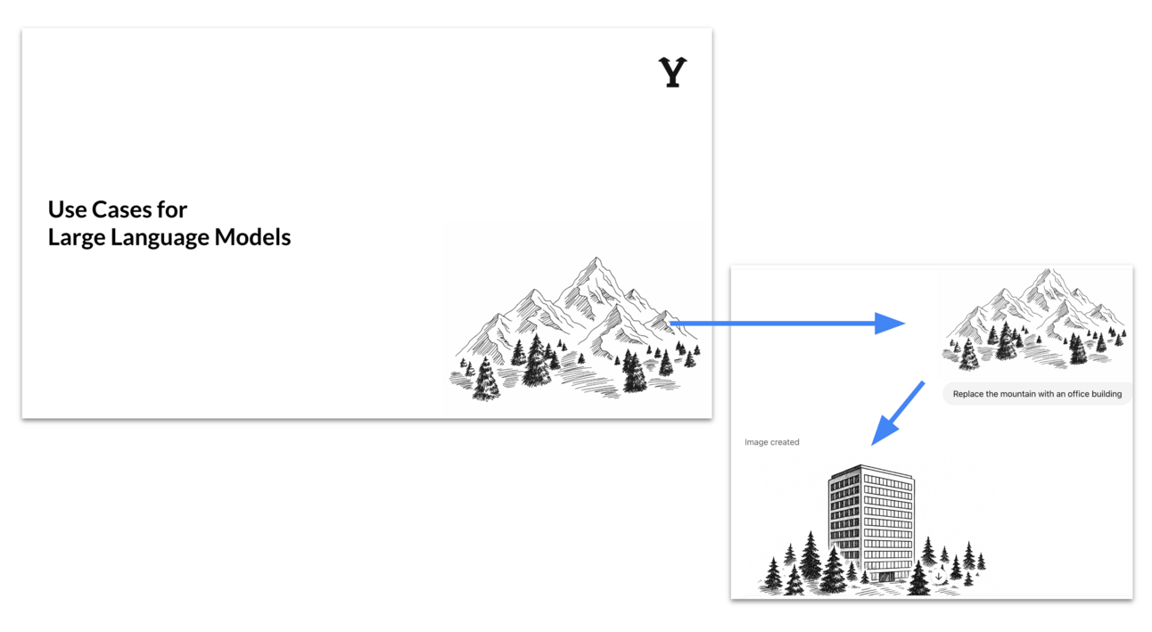 For example, the slide decks of RAPYD.AI have a certain aesthetic that feature sketch-like images like this mountain here (originally created by an designer). If I want a new motive, I can simply ask ChatGPT for this: