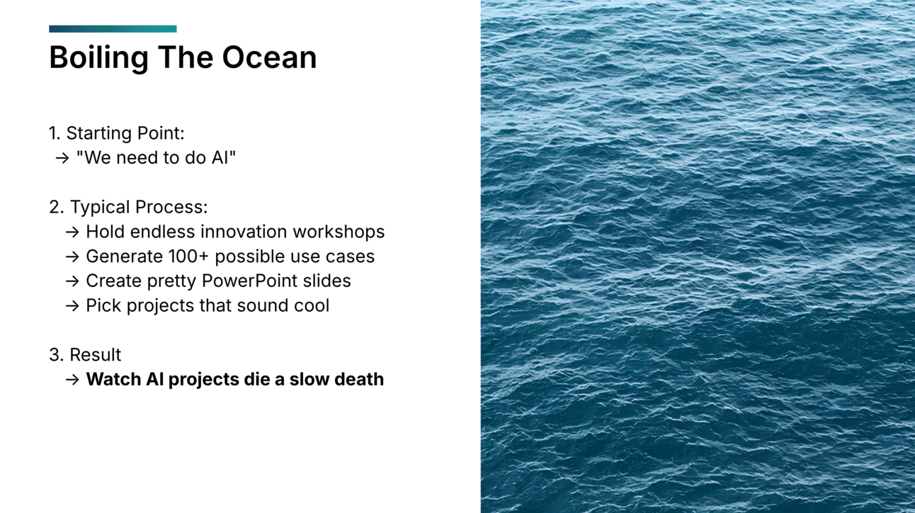 One of my early slides explains the "Boil the ocean" approach for AI and how it leads AI projects into disaster. Here’s how the slide looked: