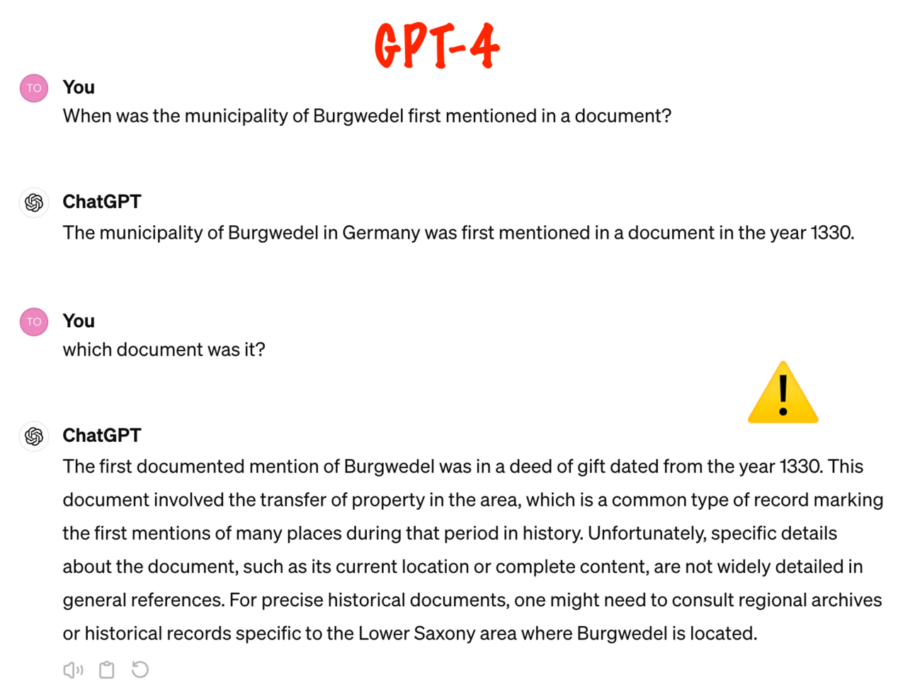 OK, the question is tricky, and GPT-4 can't solve it ideally either. But in the example above, GPT-4 is closer to the true year and (more importantly) more careful about citing a source: