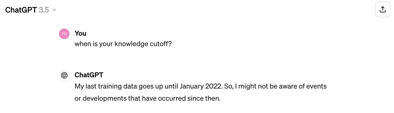 The free version of ChatGPT is what most people are familiar with. It gives you access to the basic ChatGPT 3.5 model, which is fast and cheap, and your first taste of the world of LLMs. That said, GPT3.5 is now already almost 3 years old and has a knowledge cutoff of September 2021 or January 2022, depending on whether you believe the OpenAI documentation or ChatGPT itself: