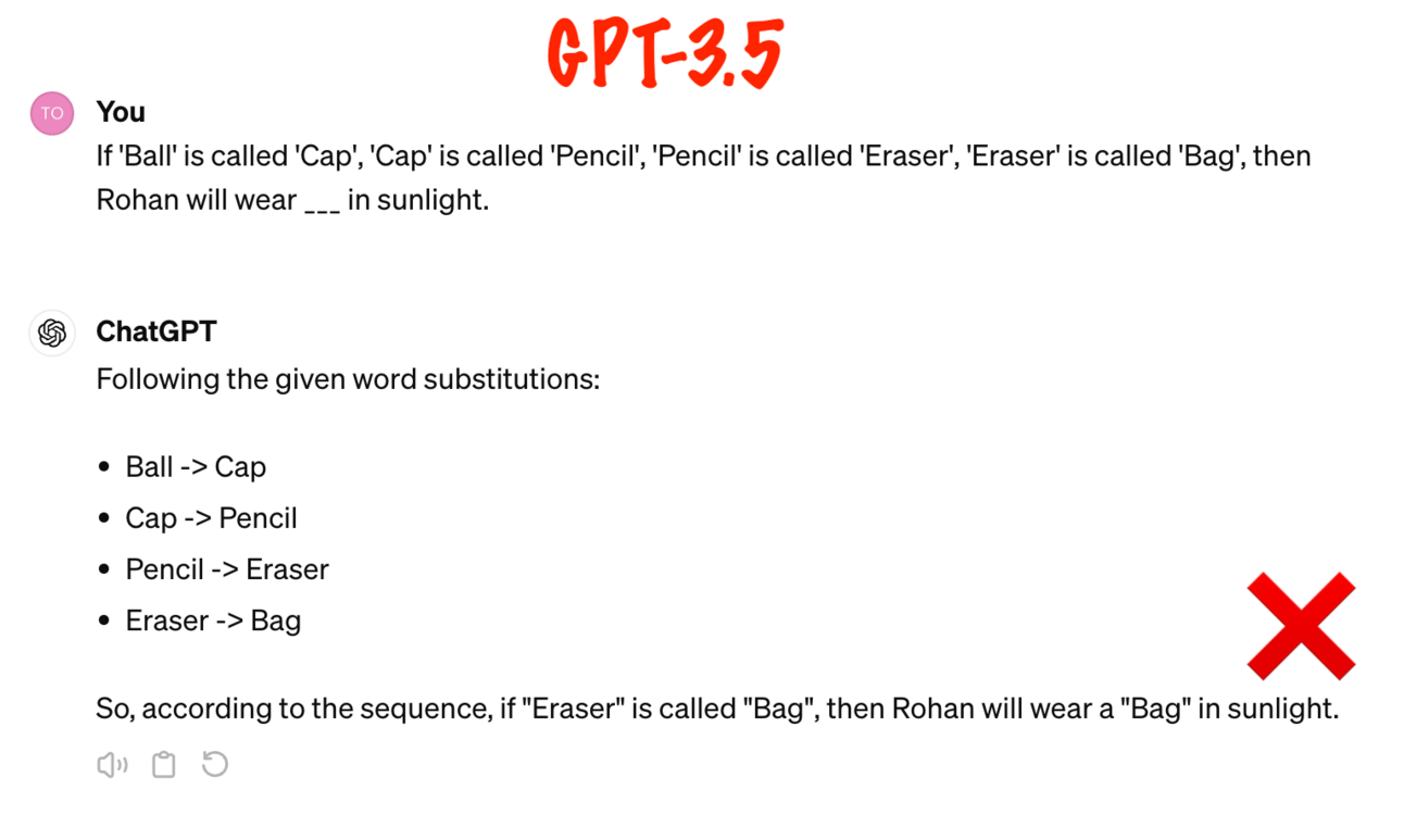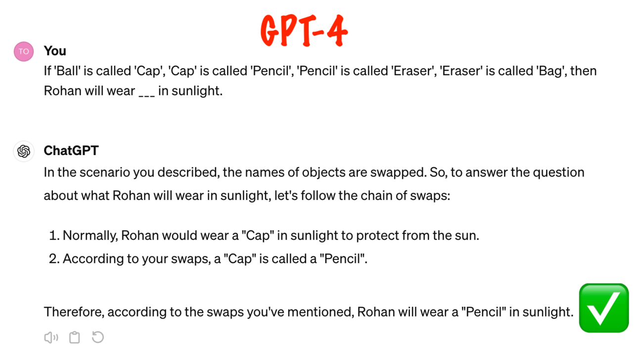 Better Reasoning: GPT-4 has what's called better "cognitive skills" such as logical reasoning. Take a look at the screenshot below to see how well each model handles this 3rd grade reasoning test: