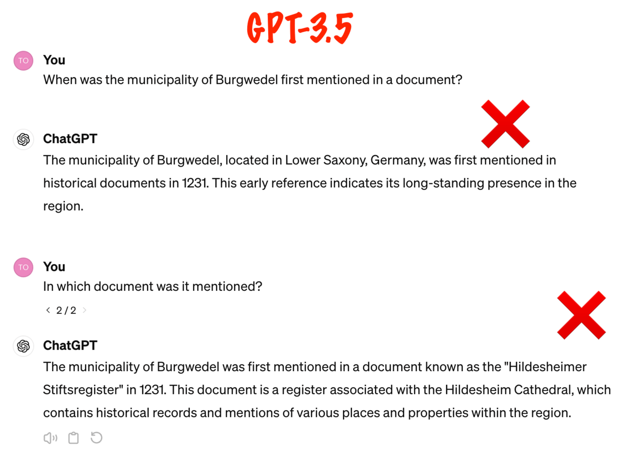 Less Hallucinations: One of the biggest problems with GPT-3.5 (to be honest, any LLM) is that it can "hallucinate" - that is, generate answers that are not grounded in reality. This happens especially when you ask questions about very niche topics (as you often do in business). GPT-3.5 is particularly prone to this type of error. For example, if I ask ChatGPT3.5 a niche question, such as when a small town near where I live was founded, it will give me a completely made-up (but confident sounding) answer. Even worse, it will hallucinate a source that doesn't even exist!
