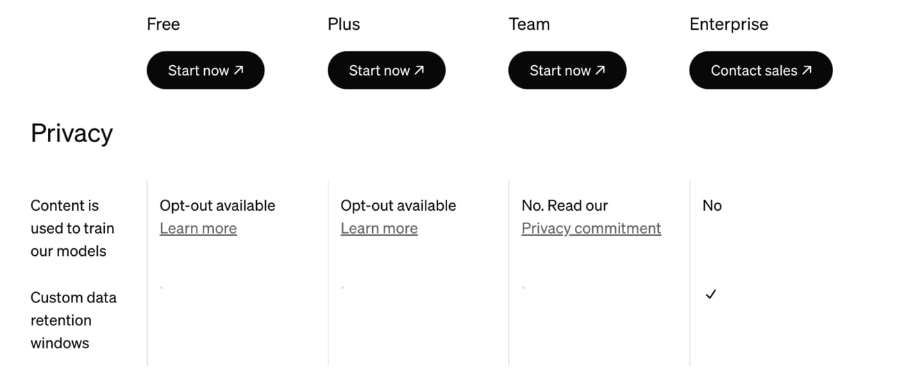 Privacy & Security: For the Free and Plus* version, OpenAI by default uses your chat data to train their models. This is a big no-go for any business. ChatGPT Teams and Enterprise offer stricter policies, prohibiting OpenAI to utilize your data by default. In addition, OpenAI provides a trust center and is certified according to SOC-2/3, CCPA and can be GDPR compliant via a data processing addendum. Heads up, this applies exclusively to B2B customers, e.g. subscribers to Team and Enterprise, not ChatGPT Plus!