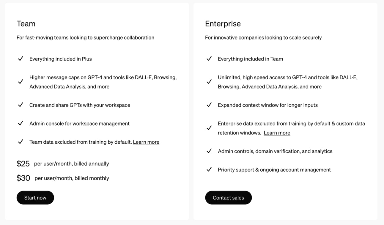 In particular, ChatGPT Team is really compelling for businesses because you get the full enterprise treatment in terms of privacy, security, and performance at a price that's only slightly above the consumer tier. Best of all, you can still cancel on a monthly basis.