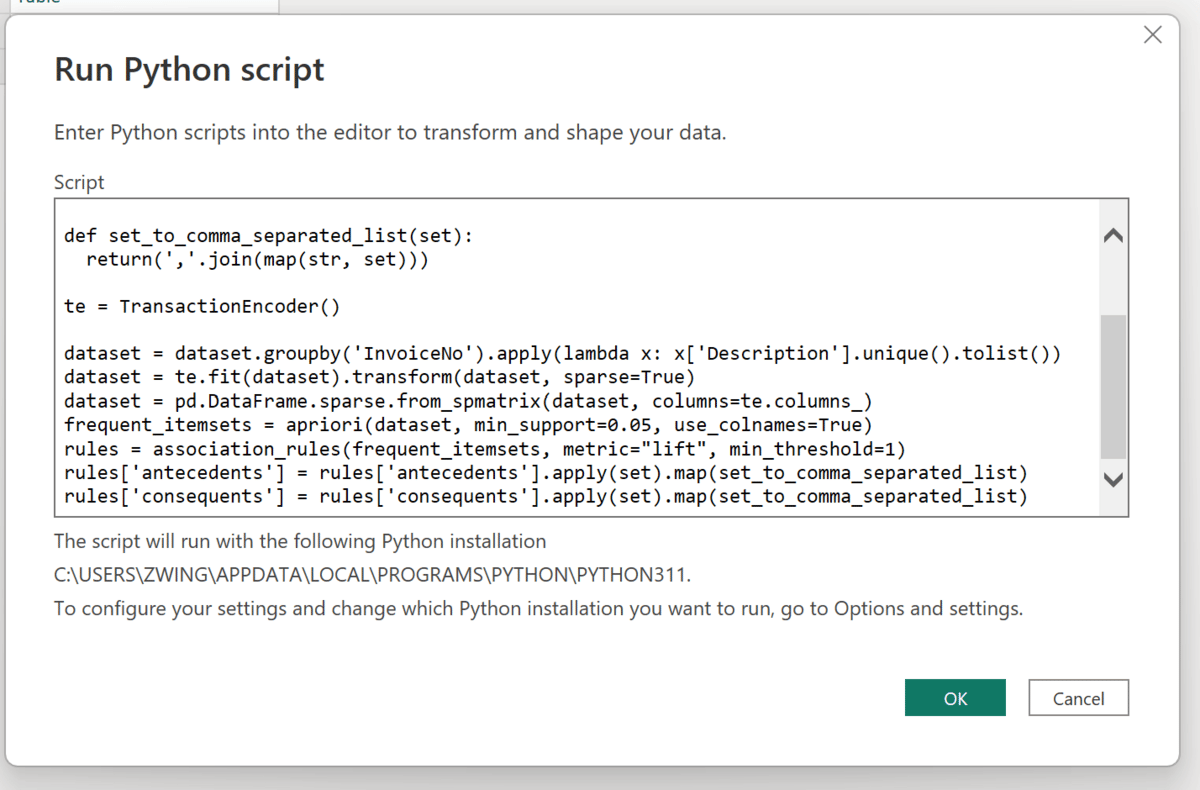 The architecture of this use case is really simple. We load the data into our BI system such as Power BI and run the association rule mining algorithm here directly from here using a small Python script.