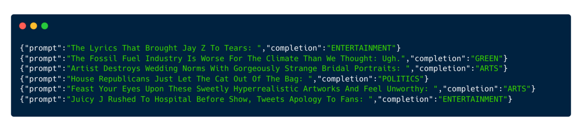 Let's say you run a news outlet and want to classify news articles automatically based on your custom topic taxonomy. In this case, you could provide a set of existing articles as the prompts and their respective news categories as the completion as shown here: