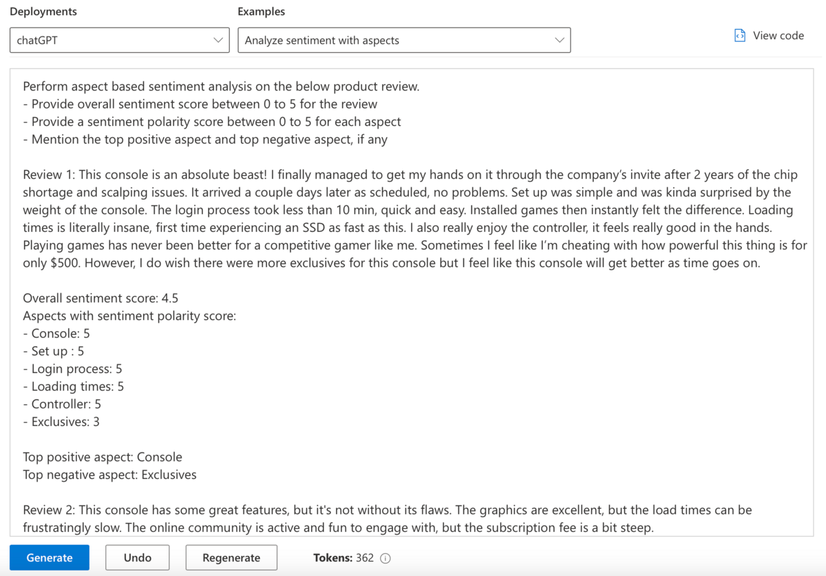 Alternatively, you can use more advanced and detailed prompts, as demonstrated in this example from the Azure OpenAI Playground: