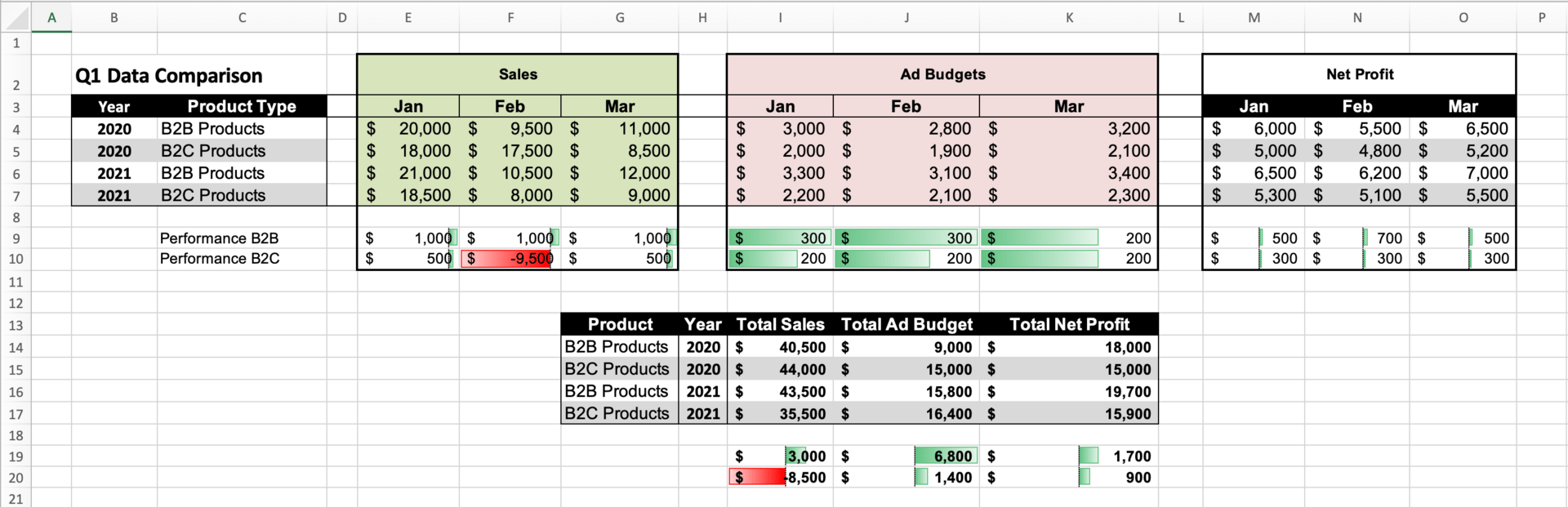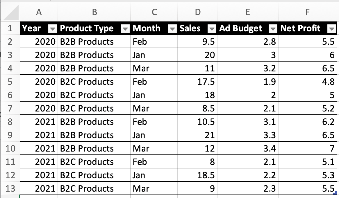 Let's say we want to know: What's the % change of Sales in the B2B product line between Jan 2020 and Jan 2021?