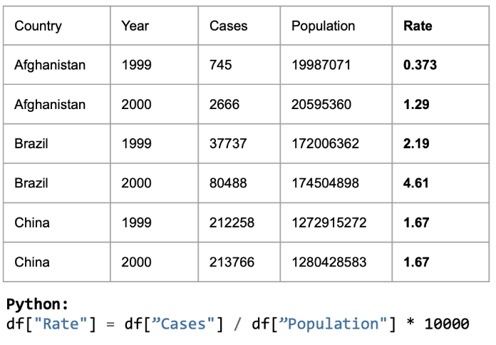 For example, calculating the Rate (Cases per Population) becomes an easy one-liner: