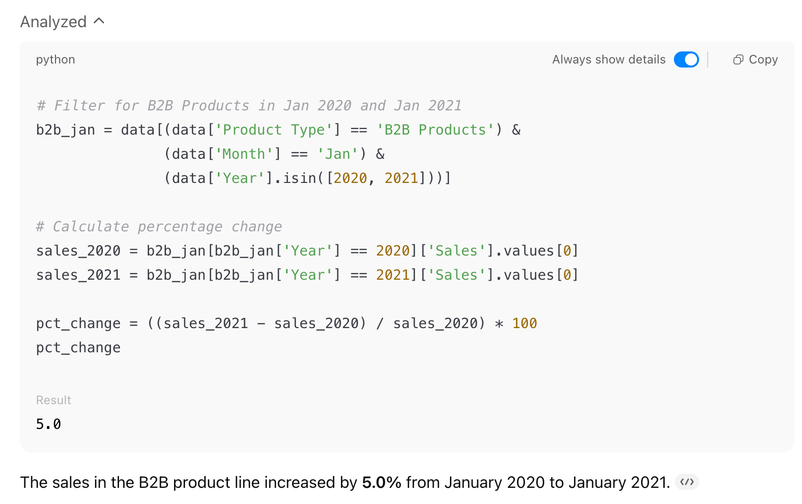 For a human, this is trivial. Just eyeball the data and calculate: Sales grew by 5%.