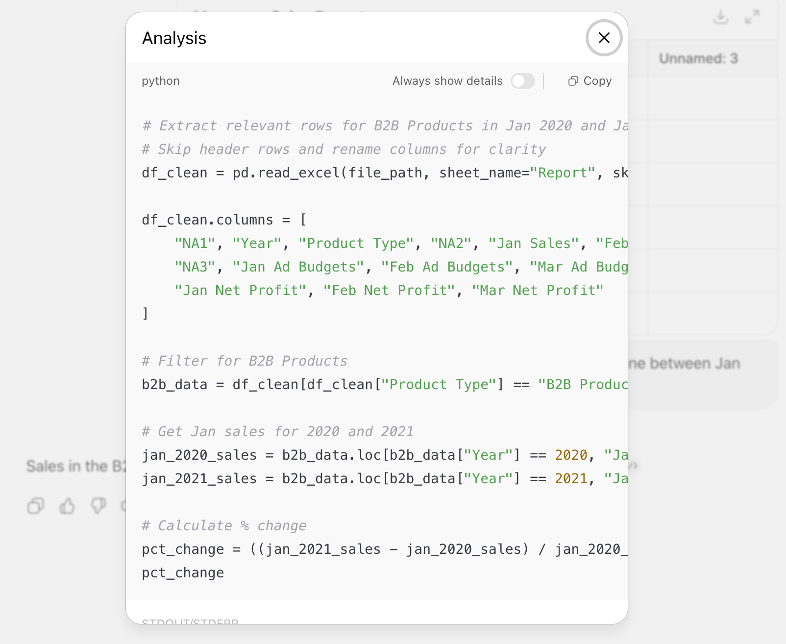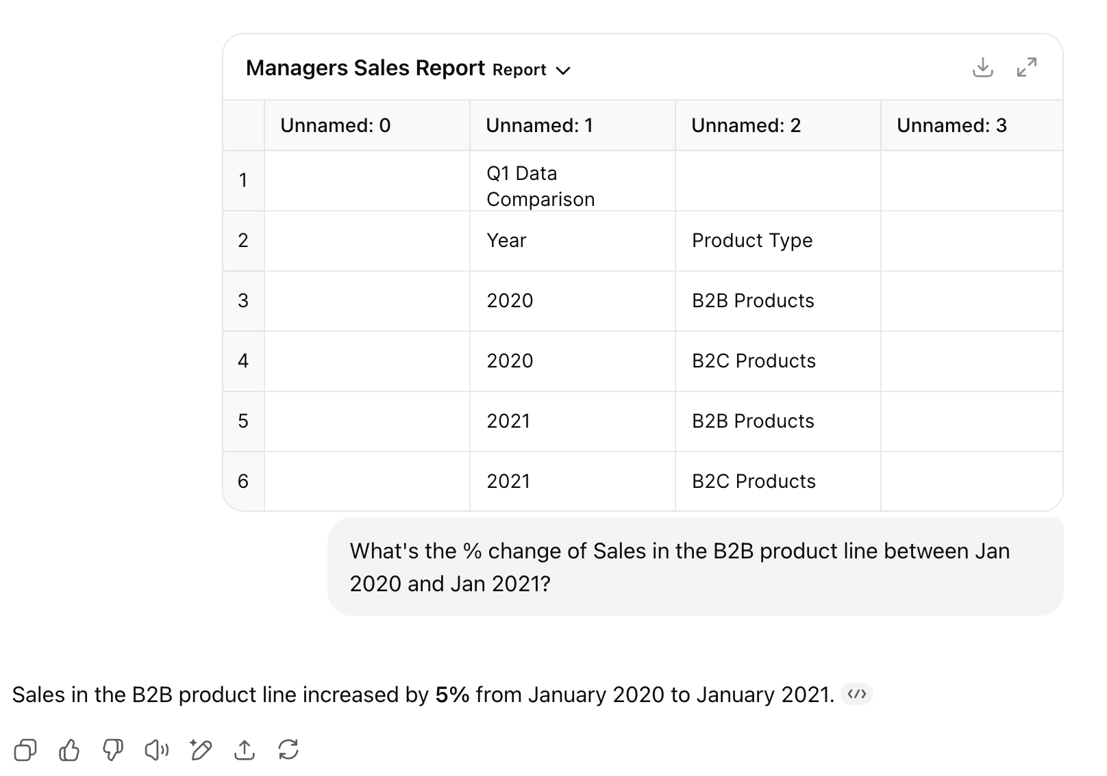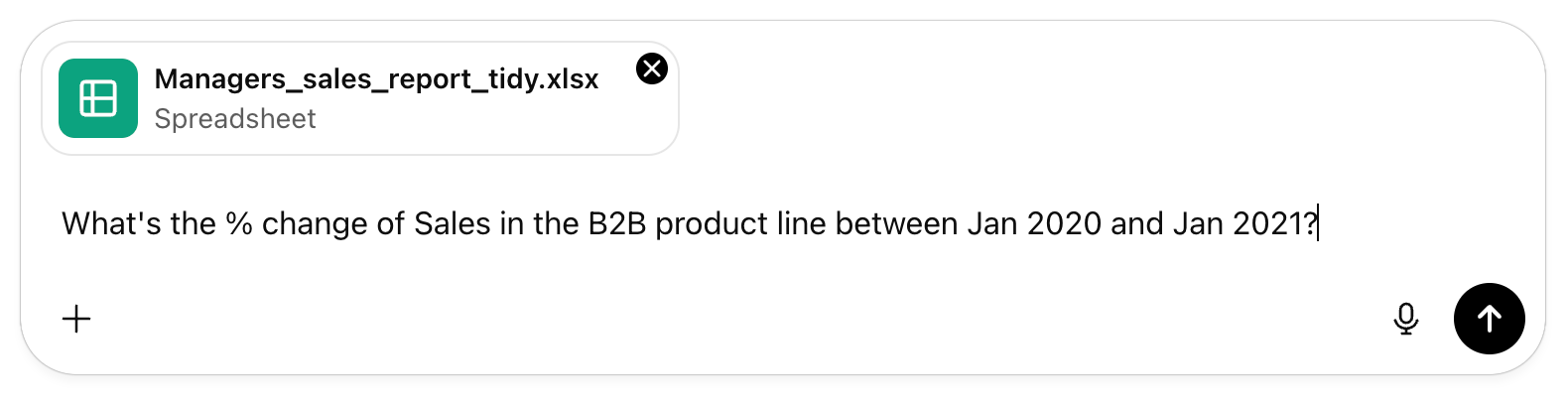 When I upload this Excel sheet to ChatGPT and ask about the % change, look what happens: