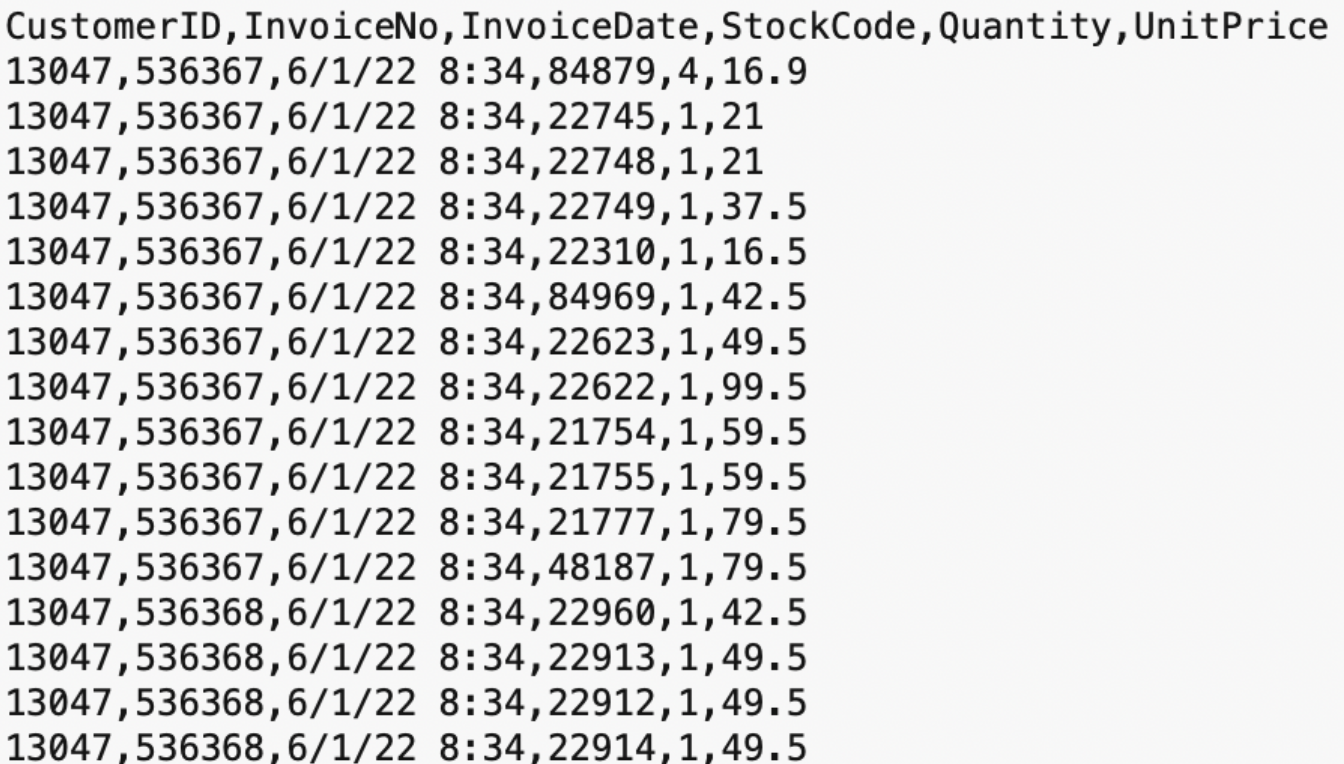 Essentially, each line is a recorded observation or "log". It often comes with a time stamp, but not necessarily. Transactional data typically gets pretty "long", not "wide", which keeps the structure consistent – and makes it super easy to analyze even large datasets in the blink of an eye with one line of code. There’s absolutely 0 problem in uploading a CSV with 100,000+ lines of transactional records to ChatGPT.