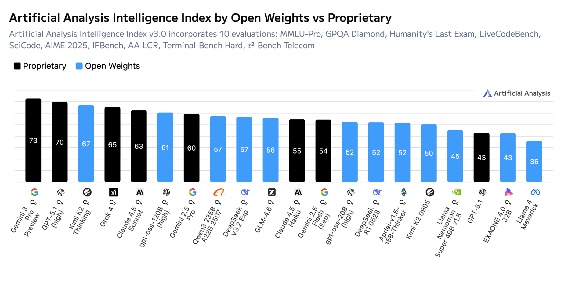 More recently, here’s the open vs. closed performance evaluation across 10+ different benchmarks as per November 2025: