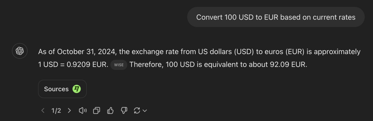 ✅ "Convert 100 USD to EUR based on current rates" (run in the Wolfram GPT)
