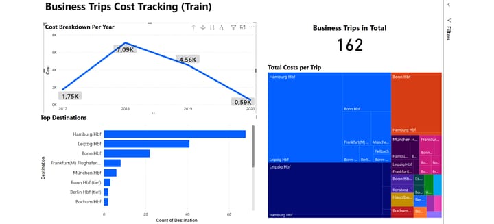 Now it's easy to create a simple report that shows not only the total travel expenses per year, but also the most popular destinations and the most popular routes (combinations of origins and destinations).