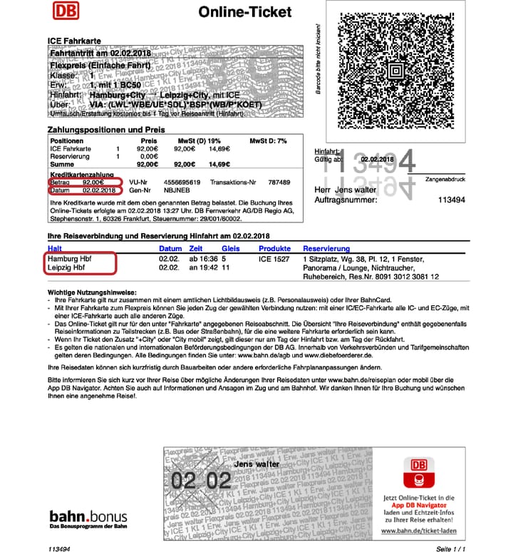 It starts with “DB” and “Online-Ticket” from the top left and ends with “Seite 1/1” on the bottom right.