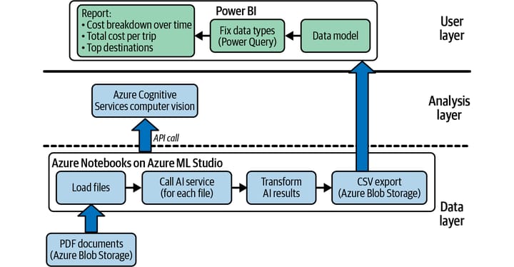 To quickly build a prototype and test feasibility, we're using an existing computer vision AI service to extract structured text elements from the PDF files (see Resources for a list of such services).