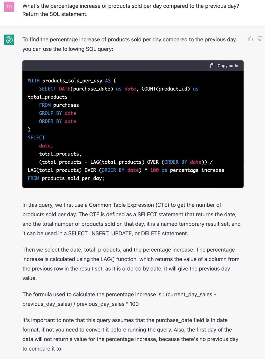 No matter how experienced a data analyst is, typing out a query like this is much slower than having it generated by chatGPT and quickly double-checking the results.