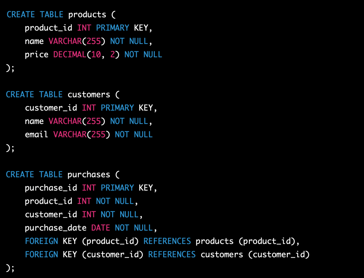 For example, our toy schema includes three tables: products, customers, and purchases.