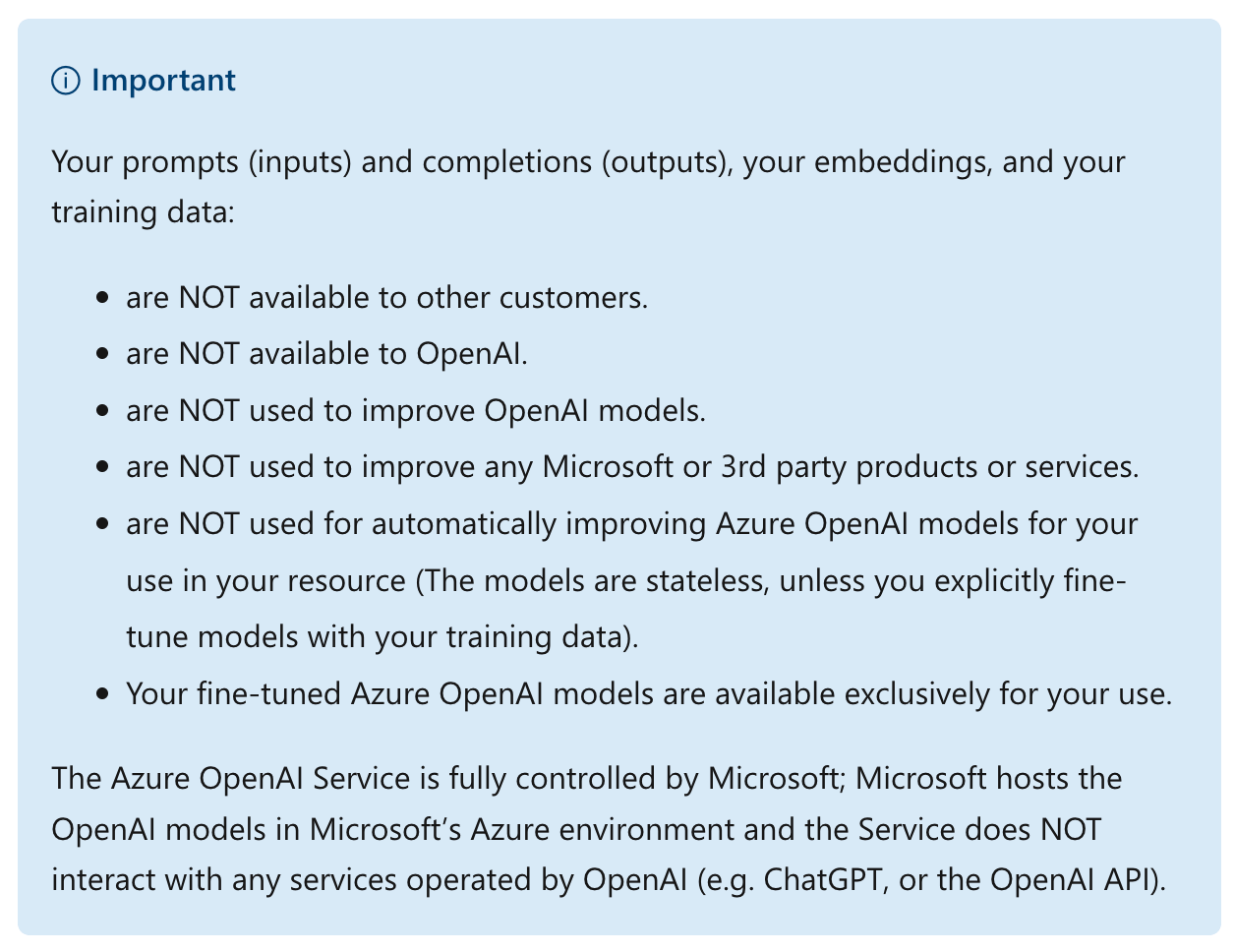 Why? Because if you're not using your own in-house open source solution, Generative AI models are usually offered as a service by third parties like OpenAI or Microsoft. Whether this is a problem or not depends on your setup. If your company gives you access to ChatGPT or a similar service, it means you're either using a more secure enterprise version or an API from a provider like Azure that has stricter privacy policies.