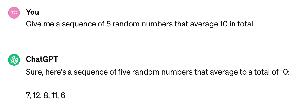But if we modify this prompt slightly and ask it to generate these numbers so they average 10, it's almost impossible for the model to do this task correctly:
