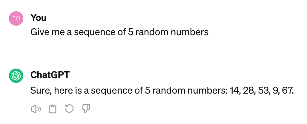 If I tell ChatGPT to give me a sequence of 5 random numbers, it will do the job pretty reliably: